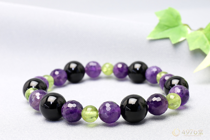 マイナス思考をプラスに変え、良い方向へ導くアメジスト、強力な魔よけの石として知られるオニキス、ポジティブなエネルギーをもたらすペリドットを組み合わせたブレスレット。マイナスの運気をプラスへと変える力があるといわれています。