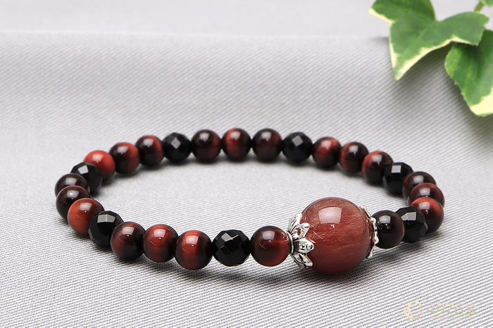 視野を広げて洞察力を高めることで、よりよい決断を下せるといわれているレッドタイガーアイと厄除けのオニキスの中に、ひときわ目立つレッドルチル。マイナスな運気を振り払って、円滑な関係を築きたい方におすすめのブレスレットです。